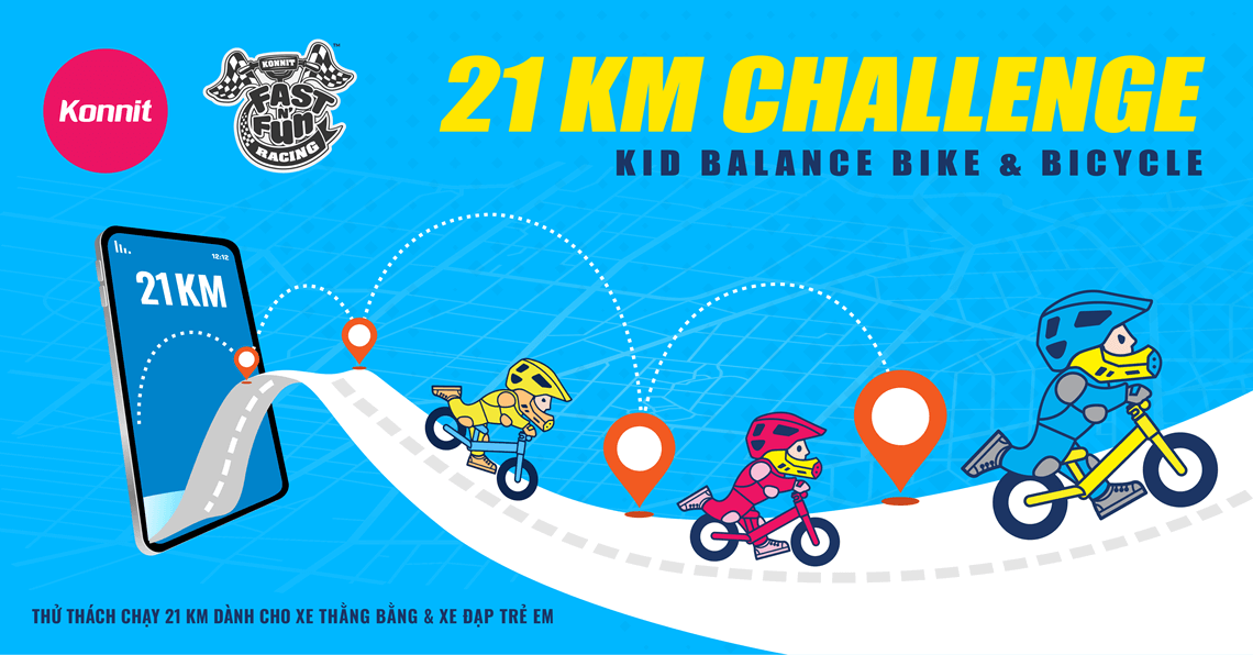 Konnit Fast N’ Fun Virtual Ride | 21Km Challenge là thử thách hoàn thành 21km cùng xe thăng bằng và xe đạp đầu tiên dành cho các bạn nhỏ từ 2 - 12 tuổi tại Việt Nam. Chương trình được tổ chức bởi Konnit Group - đơn vị tiên phong trong lĩnh vực thiết kế và cung cấp các trải nghiệm chơi để học dành cho bé từ 2-12 tuổi và gia đình nhằm chuẩn bị cho bé tư duy và kỹ năng sẵn sàng khám phá thế giới xung quanh; và iRace - nền tảng website cung cấp các giải thể thao và thử thách trực tuyến đến những người đam mê vận động hoặc mong muốn duy trì lối sống lành mạnh, tích cực hơn thông qua các hoạt động thể dục – thể chất hàng ngày.