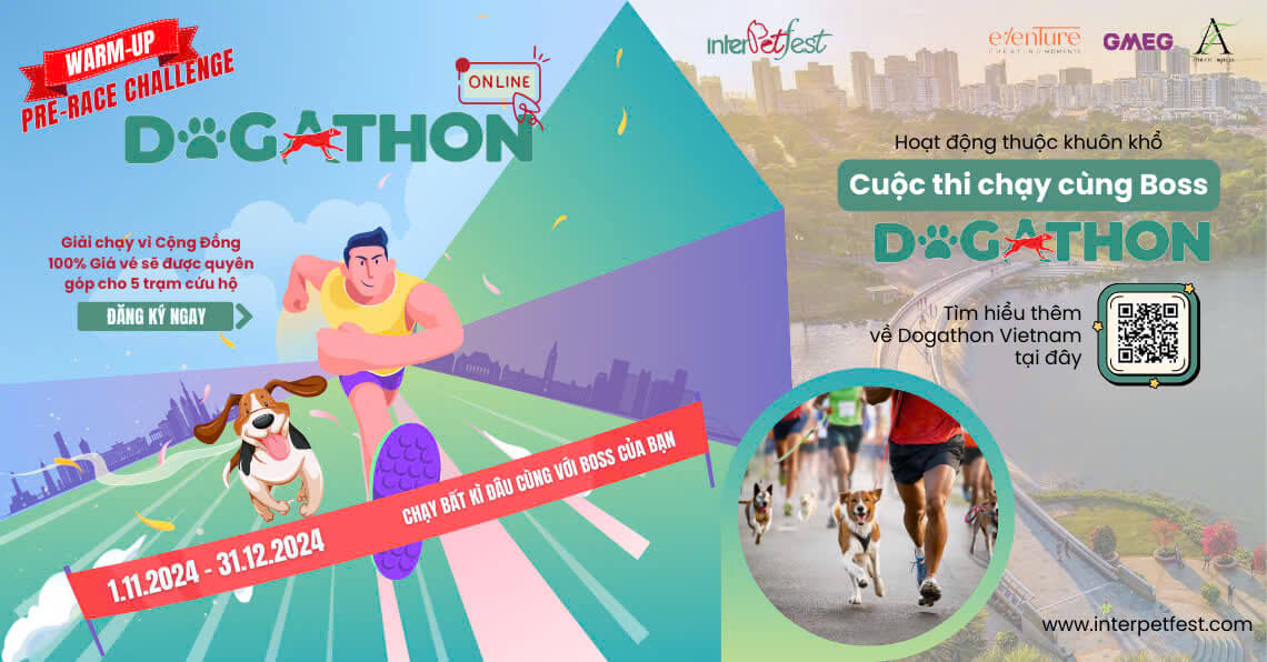 Khởi động cho Dogathon: Cuộc thi online là cơ hội tuyệt vời để cả bạn và chú chó bắt đầu tập luyện và làm quen với tinh thần Dogathon. Đây là bước chuẩn bị hoàn hảo trước khi bước vào cuộc đua thực tế đầy hào hứng vào vài tháng tới (Đăng ký tại đây).